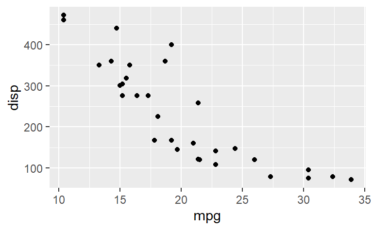 geom_point(aes(mpg, disp))